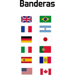 - 9 Etiquetes amb text, bandera i nom. 2 Etiquetes bandera seleccionada mida 40 x 22 mm. 2 Etiquetes amb bandera i nom mida 42 x 7 mm. 3 Etiquetes amb bandera i nom mida 90 x 15 mm. 2 Etiquetes amb bandera i nom mida 135 x 20 mm